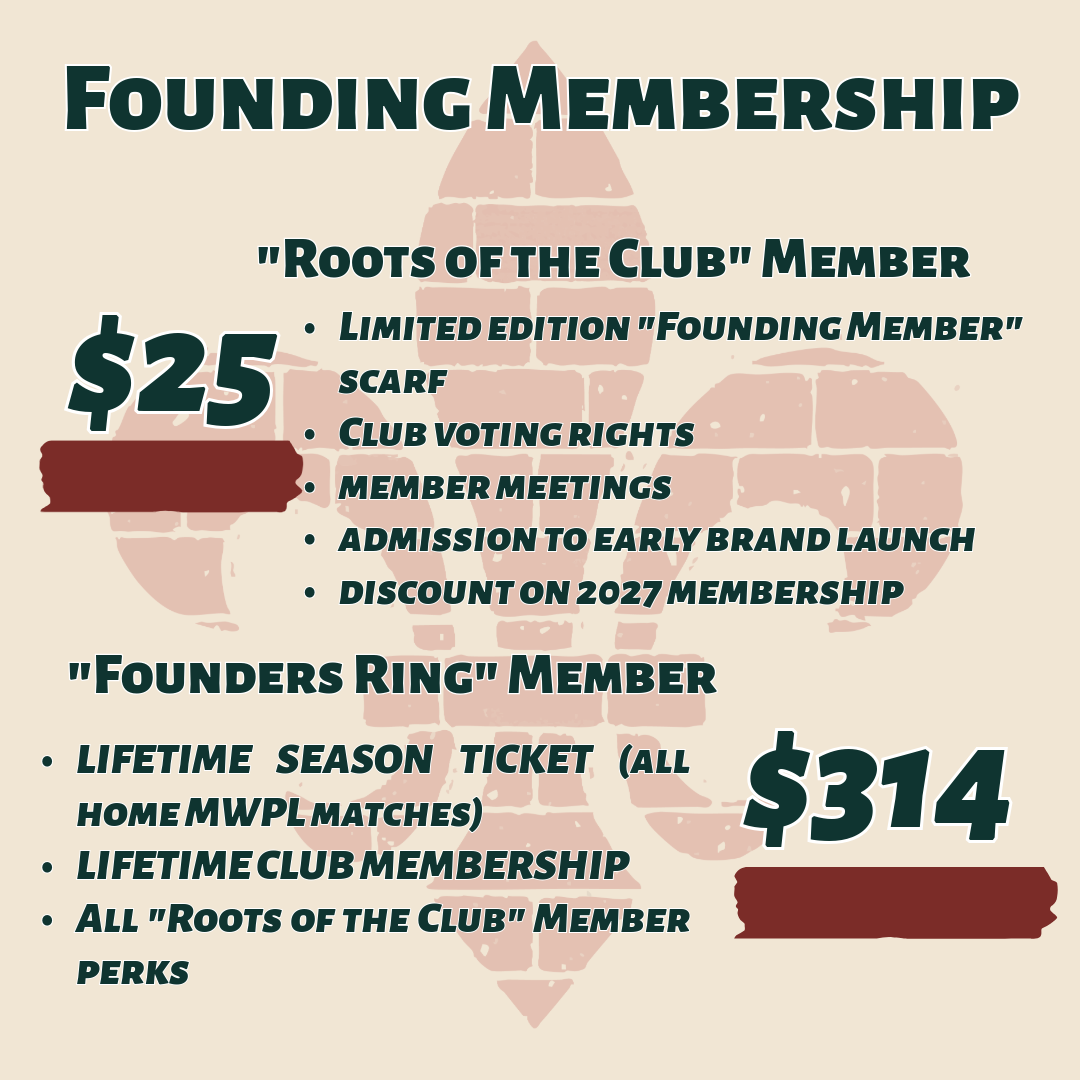 The $25 “Roots of the Club” Member option includes full club voting rights, access to in-person community events, admission to our early branding reveal party, and a limited-edition Founding Member scarf.